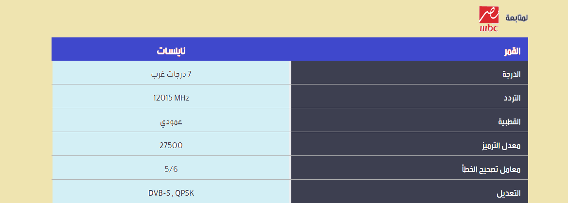 يمكنكم استقبال قناة إم بي سي مصر عبر القمر الصناعي نايل سات، فقط على الترددات الآتية: