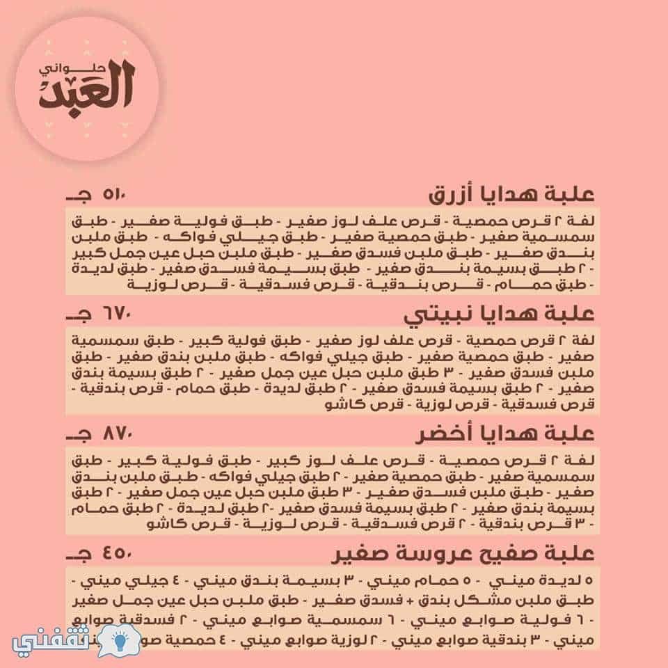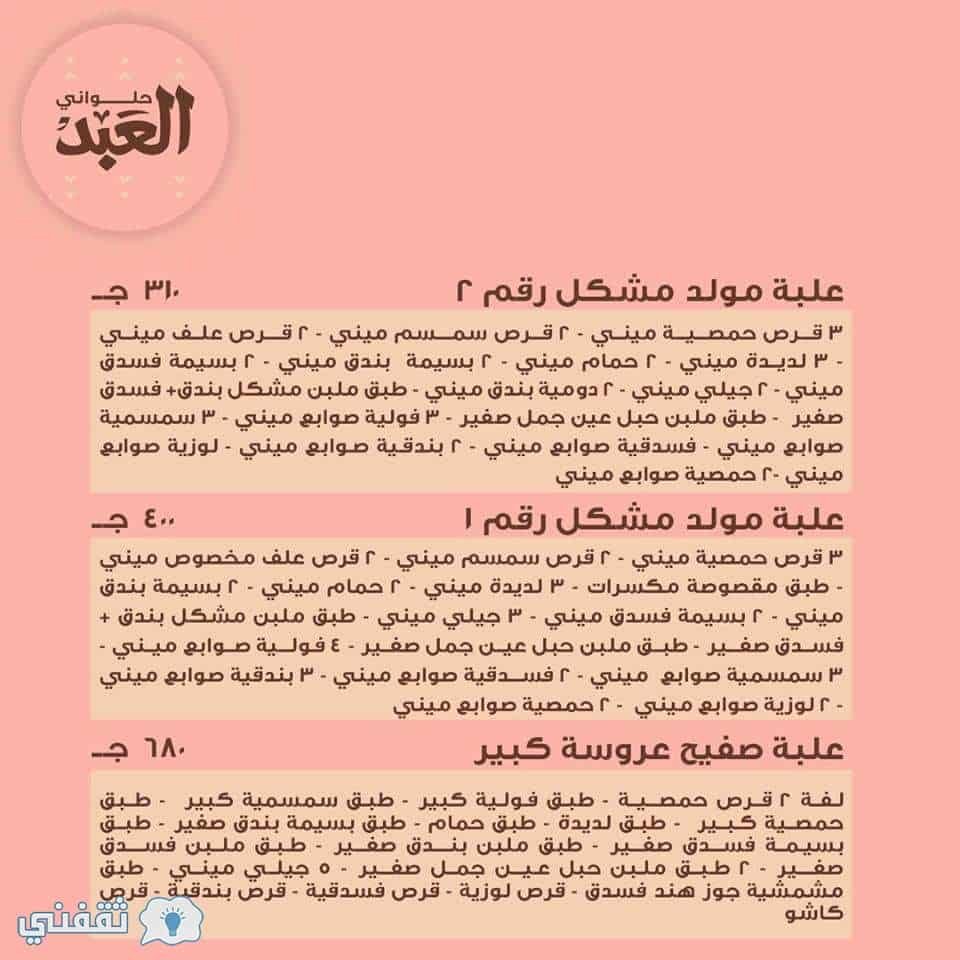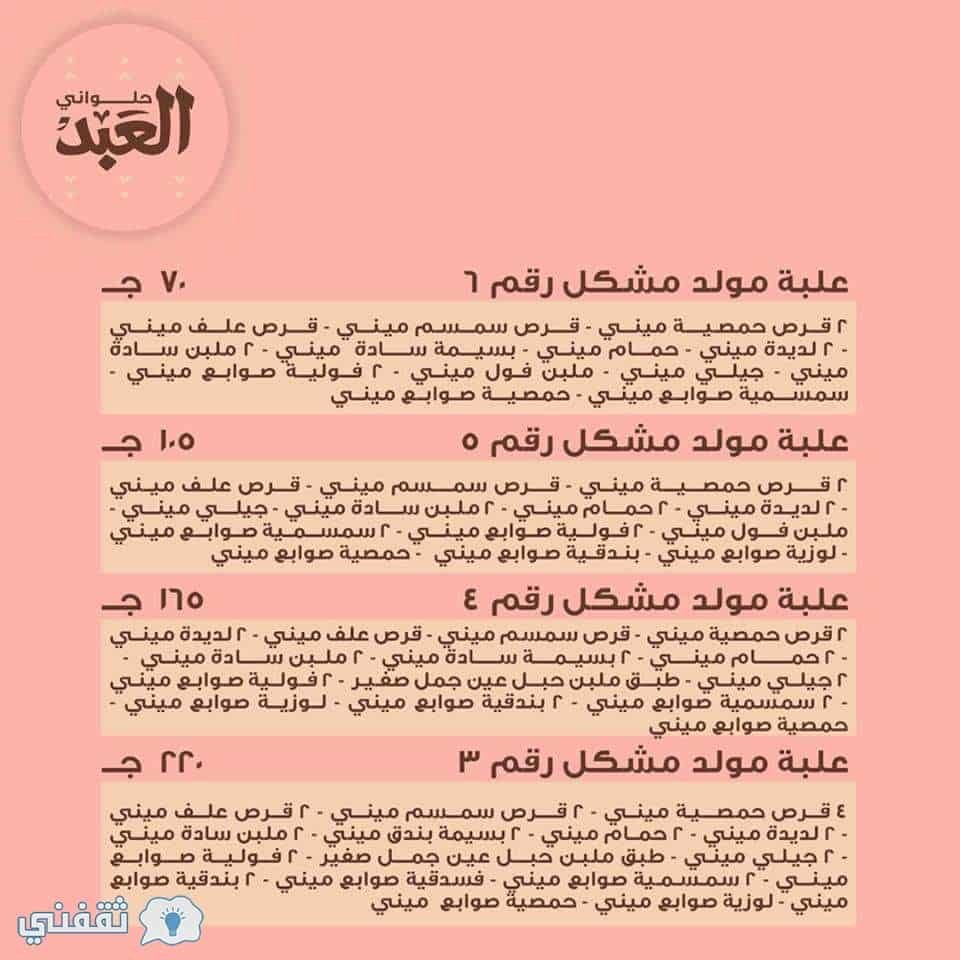 أوضحت محلات العبد أسعار حلاوة المولد المعلبة الكبيرة والمتوسطة والصغيرة بالشرح لمحتويات كل علبة وسعرها تيسيرا على الراغبين في الشراء وهي :