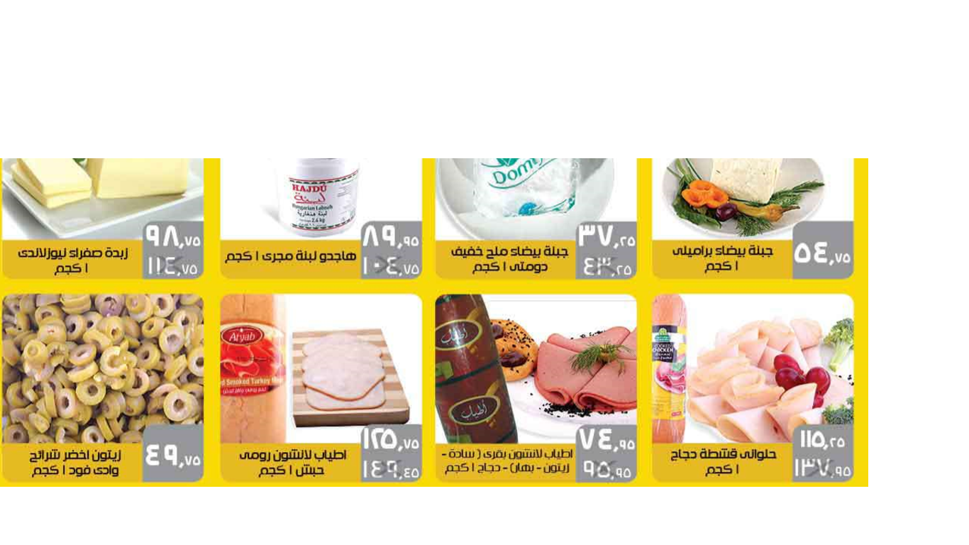 وعرض على جبنه بيضاء براميلي 1 كيلو جرام بسعر 54.75 جنيه، وعرض على جبنة بيضاء ملح خفيف دومتي 1 كيلو جرام بسعر 37.25 جنيه، وعرض على هاجدو لبنة مجري 1 كيلو جرام بسعر 89.95 جنيه، وعرض على زبدة صفراء نيوزلاندي 1 كيلو جرام بسعر 98.75 جنيه.