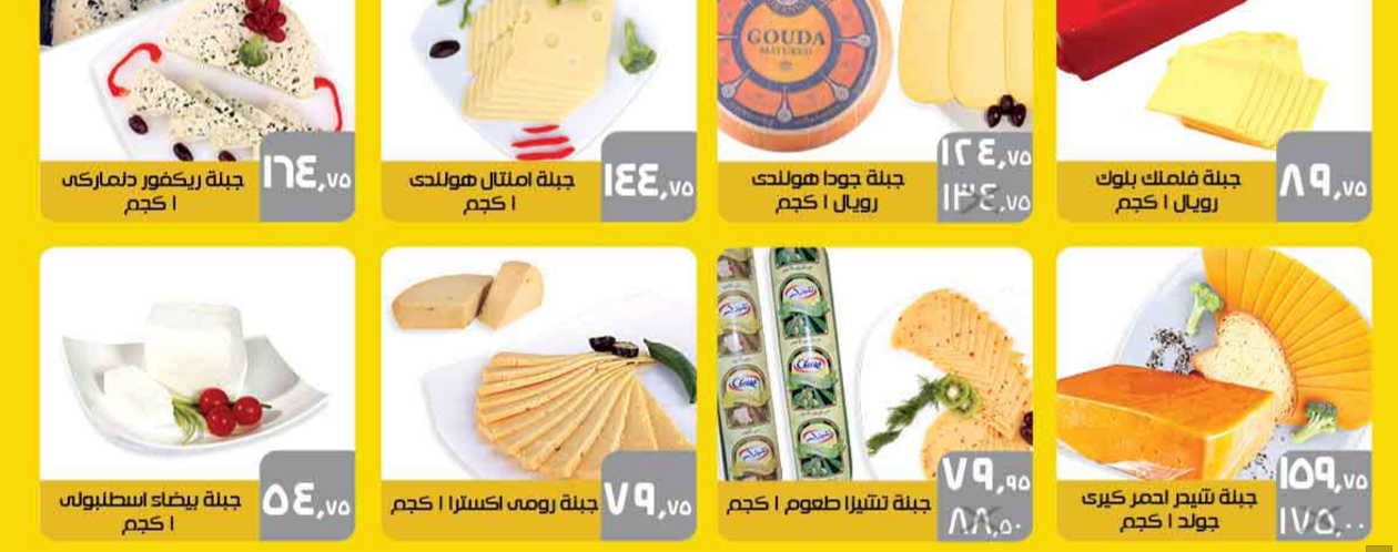 وهناك عرض على جبنة فلمنك بلوك رويال 1 كيلو جرام بسعر 89.75 جنيه، وهناك عرض على جبنة جودا هولندي رويال 1 كيلو جرام بسعر 124.75 جنيه، وعرض على جبنة امنتال هولندي 1 كيلو جرام بسعر 144.75 جنيه، وعرض على جبنه ريكفورد دنماركي 1 كيلو جرام بسعر 164.75 جنيه.