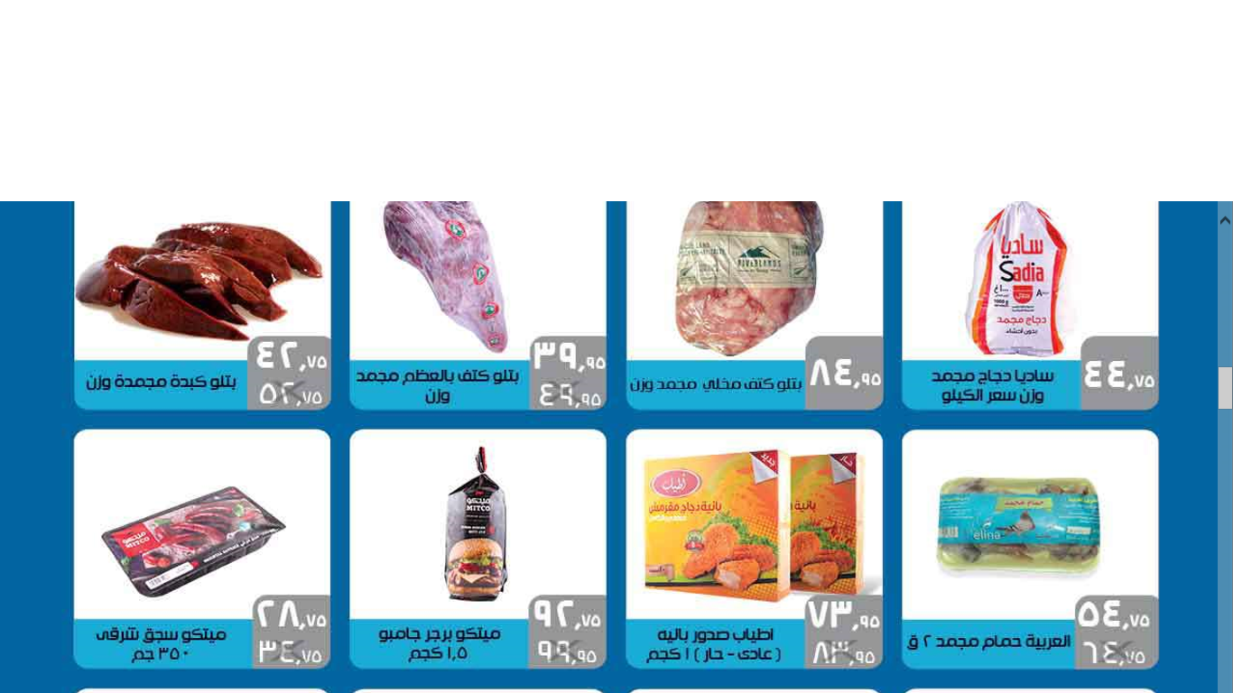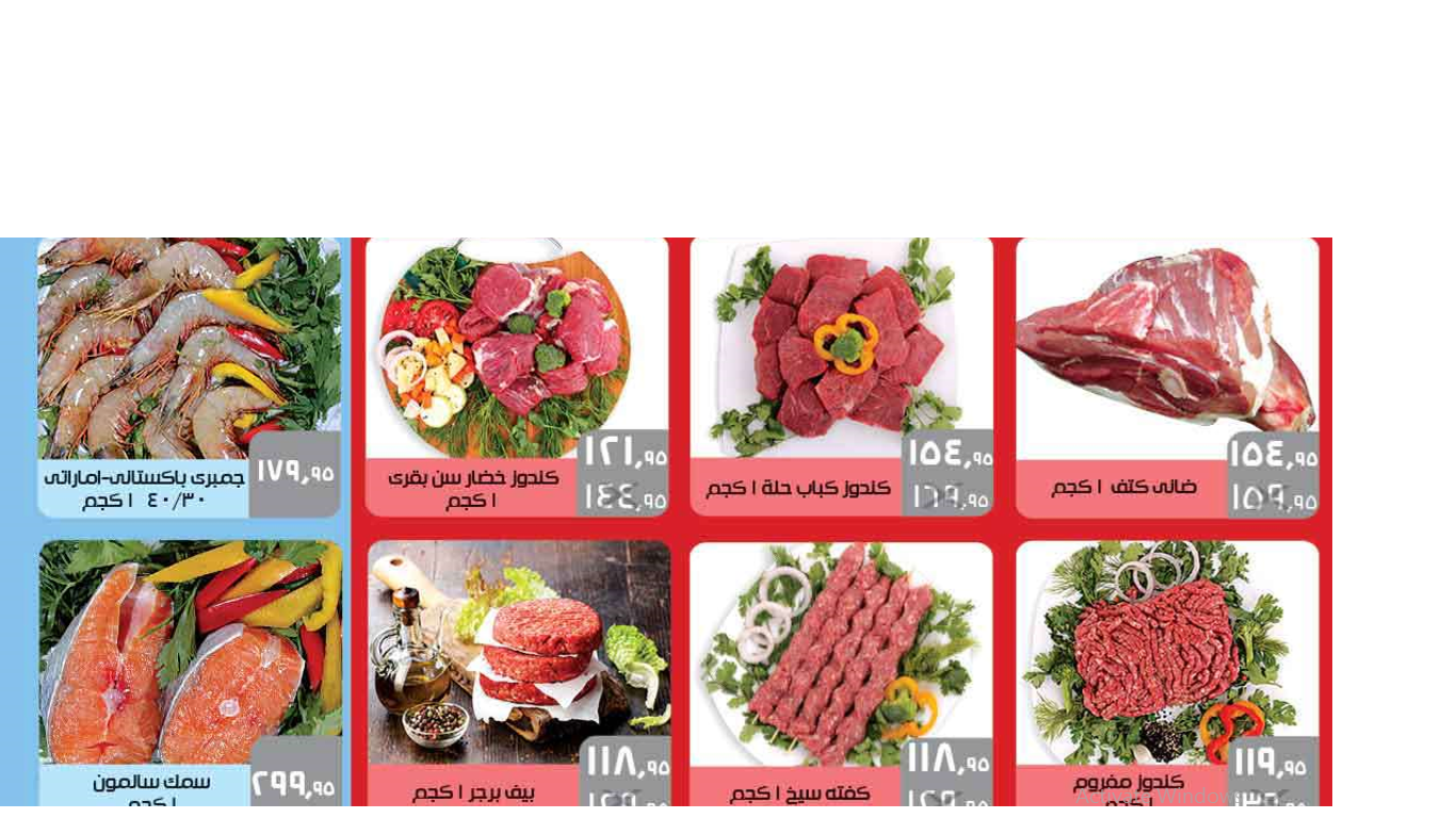 وهناك عرض على كفتة شيخ 1 كيلو جرام بسعر 118.95 جنيه، بدلاً من 129.95 جنيه، وعرض على بيف برجر 1 كيلو جرام بسعر 118.95 جنيه بدلاً من 129.95 جنيه، وعرض على سجق شرقي 1 كيلو جرام بسعر 118.95 جنيه.
