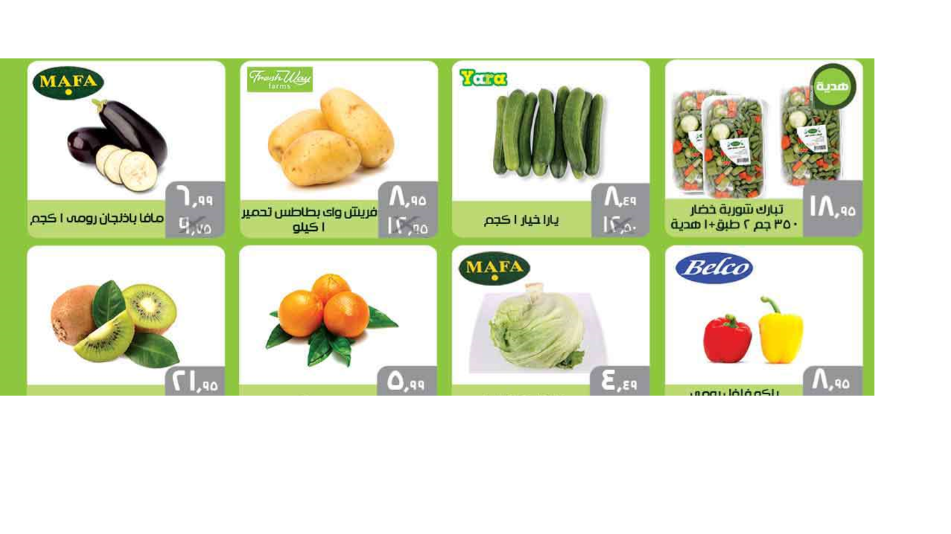 وهناك عرض على مافا باذنجان رومي 1 كيلو جرام بسعر 6.99 جنيه بدلاً من 9.75 جنيه، وعرض على بلك فلفل رومي أحمر أو أصفر 500 جرام بسعر 8.95 جنيه بدلاً من 12.50 جنيه، وعرض على مافا كابوتشا بقطعة بسعر 4.49 جنيه بدلاً من 6.95 جنيه، وعرض على برتقال بسرة سعر الكيلو جرام 5.99 جنيه بدلاً من 8.95 جنيه.