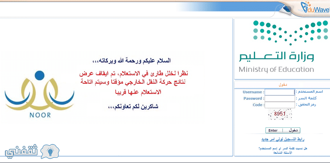 يشهد موقع نظام نور 1438 الآن عطل في الدخول إليه، في حالة تزاحم من المعلمين والمعلمات للإطلاع على نتائج النقل الخارجي، لكن الموقع ترك رسالة تفيد بأن التوقف في موقع نور بسبب أعمال الصيانة والتحديث وشاكراً الزوار للدخول للموقع، كما تم إيقاف نتائج حركة النقل الخارجي للمعلمين والمعلمات.