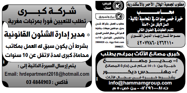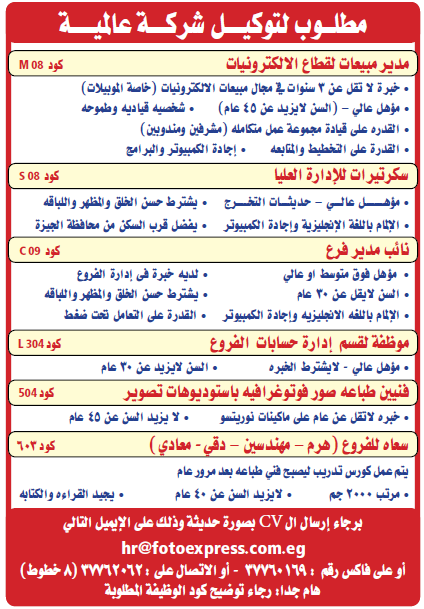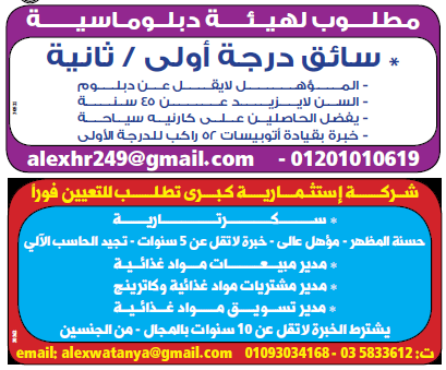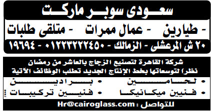 كما يحتاج سعودي سوبر ماركت لطيارين وعمال ممرات ومتلقي طلبات وللاستفسار يرجي الاتصال علي الأرقام المذكورة بالإعلان، كما أيضا تحتاج شركة القاهرة لتصنيع الزجاج بالعاشر من رمضان لموظفين لشغل الوظائف المعروضة (فنيين ميكانيكا وفنيين تركيبات وبرادين ولحامين).