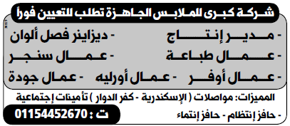 تعرض شركة كبرى للملابس الجاهزة عن حاجتها لموظفين في مختلف المجالات فتحتاج الي :